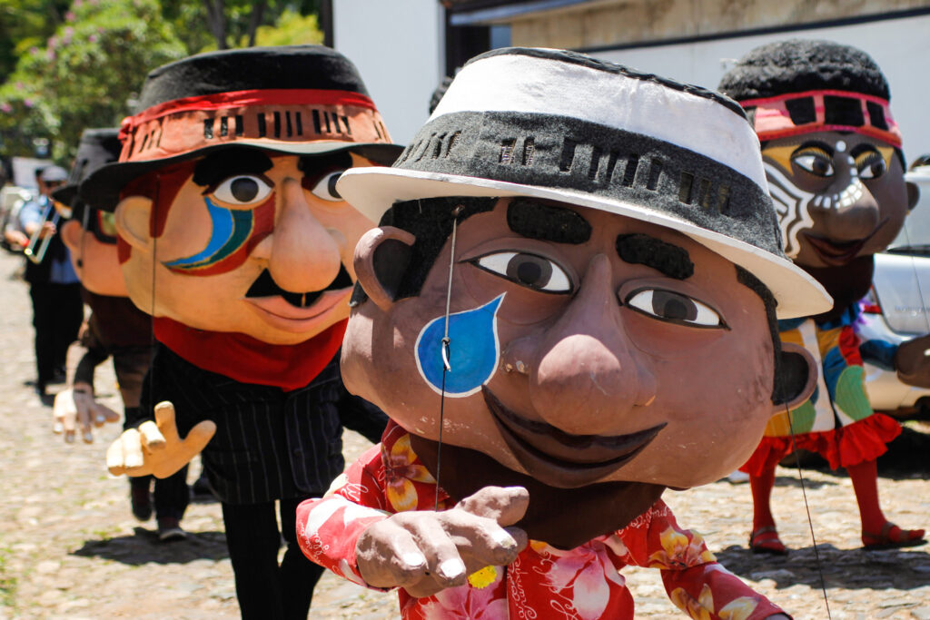 A música ao vivo conduz o caminhar dos bonecos, enquanto os manipuladores-brincantes dão vida às figuras gigantes, criando cenas espontâneas, momentos de humor, encantamento e surpresa. O Carnaval se reafirma, assim, como um território de encontro, celebração e imaginação coletiva.